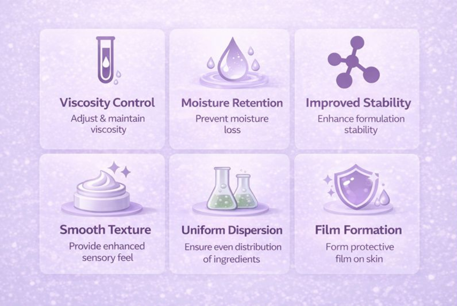 CMC는 친수성 고분자 구조로 인해 수분을 포집하고 유지하는 능력이 우수하며, 피부 표면에서 수분 증발을 완화하는 역할을 할 수 있습니다.