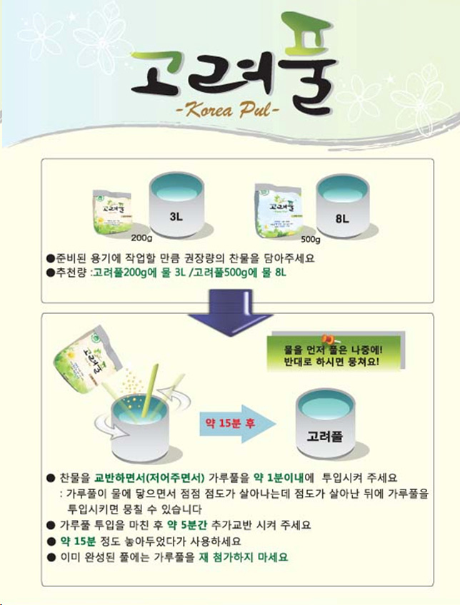 이미 완성된 풀에는 가루풀을 재 첨가하지 마세요.
