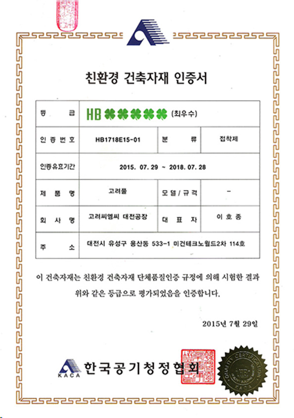 - 친환경 인증 건축 자재 (한국공기청정협회(KACA) 인증)